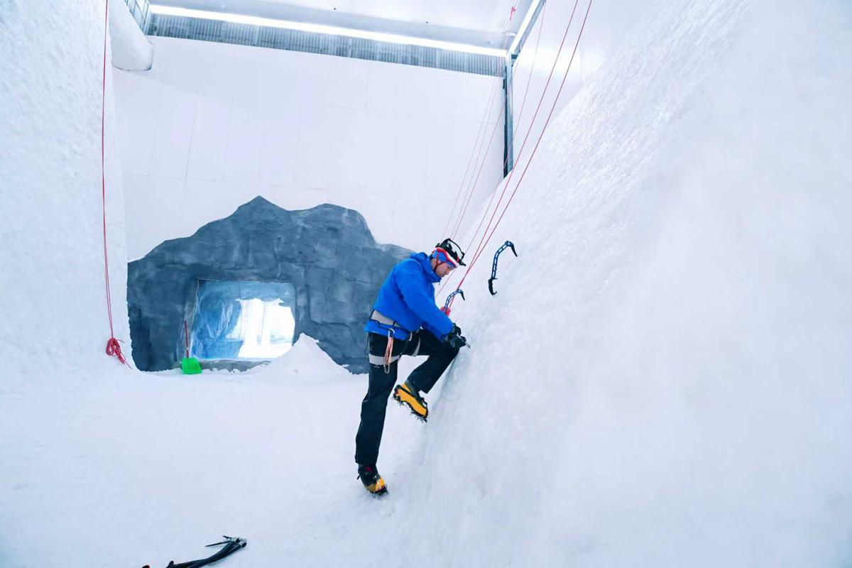 The facility, named Ice Panda, is designed with multiple difficulty levels. Ice climbers of varying skill can choose from a 60-degree gentle slope, a 79-degree steep slope, and a 90-degree vertical ice wall.