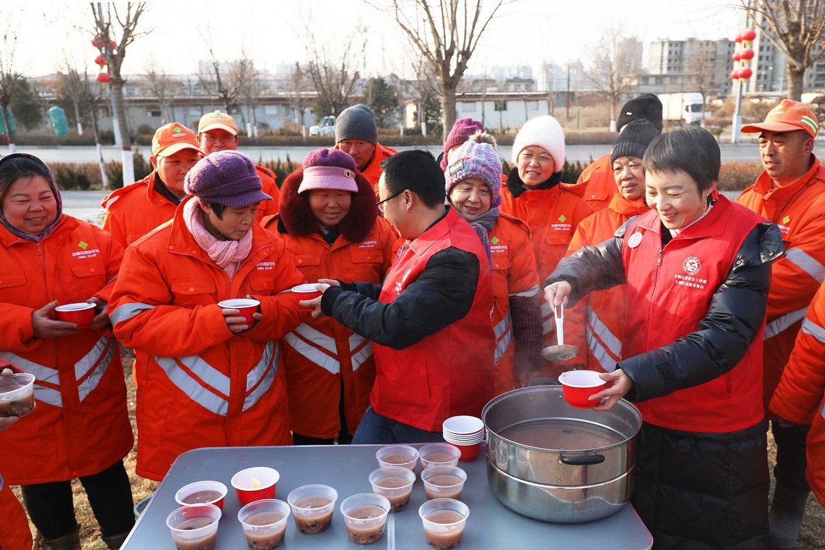 Volunteers distribute free Laba porridge to sanitary workers in Fengrun district of Tangshan, North China's Hebei province, Jan 24, 2026. [Photo/Xinhua]