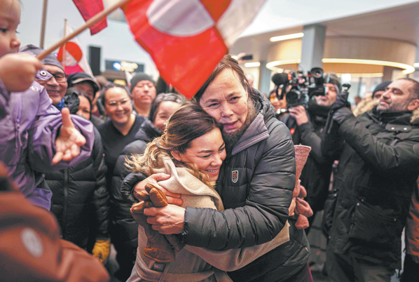 Greenland's Foreign Minister Vivian Motzfeldt (center right) hugs a woman after arriving at the airport in Nuuk on Jan 20 as she returned after meeting with US Vice-President JD Vance. EVGENIY MALOLETKA/AP
