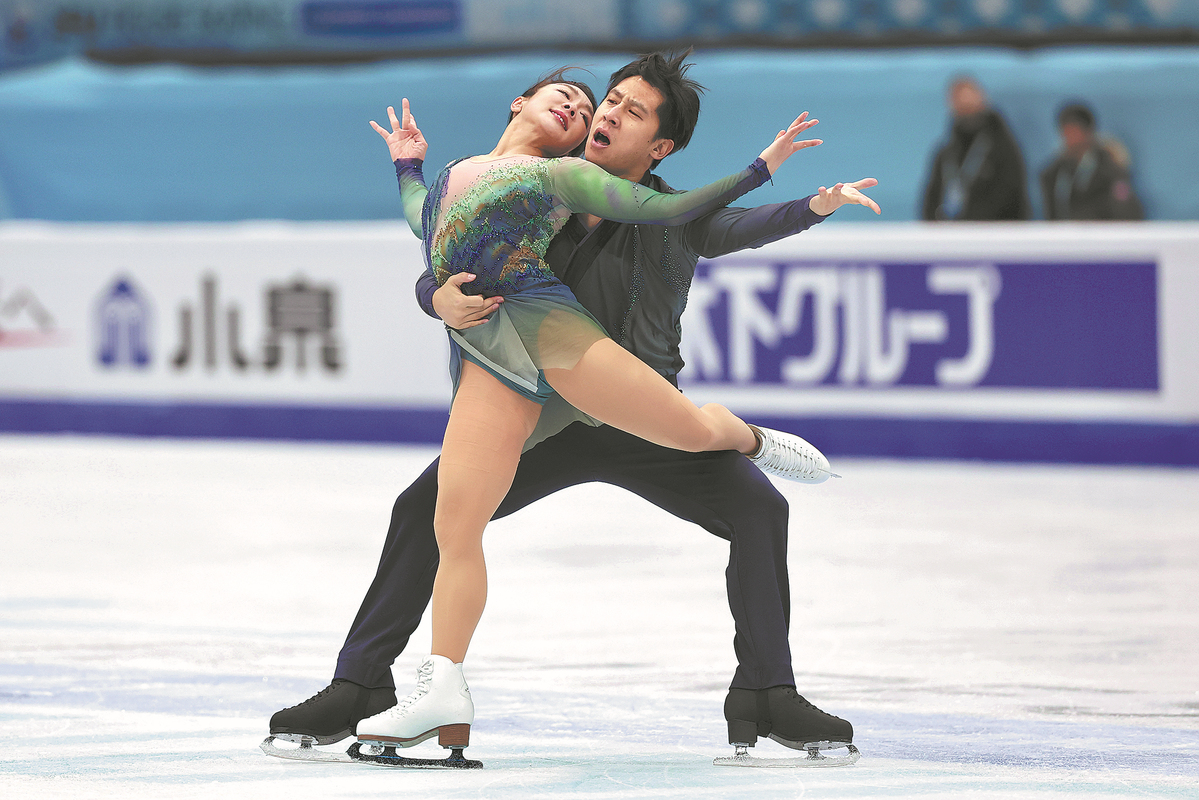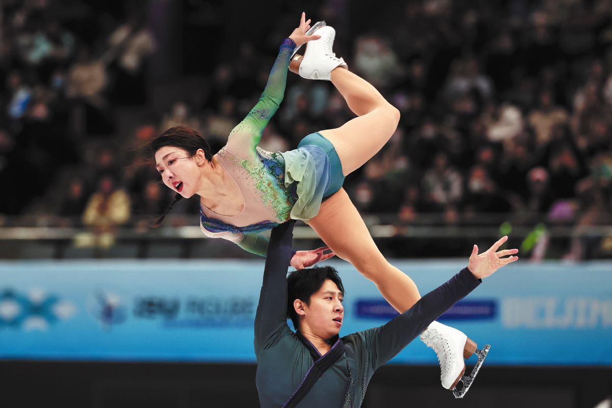 China's Olympic champion duo Sui Wenjing (top) and Han Cong compete in the pairs free skating at the ISU Four Continents Figure Skating Championships in Beijing on Saturday. [Photo by Wei Xiaohao/China Daily]