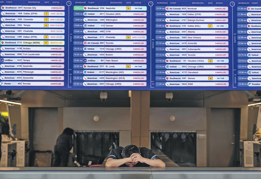 A terminal worker bows his head at LaGuardia Airport in New York on Monday, as a major winter storm spreads across a large swath of the United States. DAVID DELGADO/REUTERS