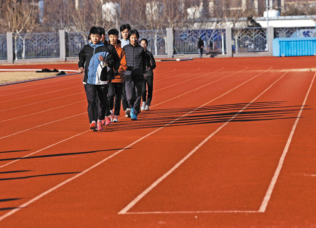 Racewalkers practice their techniques on track. LAN HONGGUANG/XINHUA