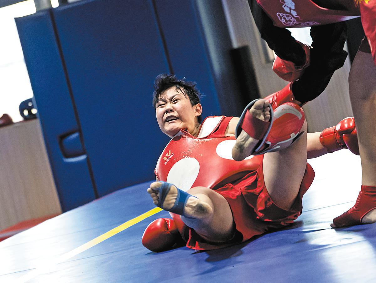 A student stumbles during a sanda martial art training session. LAN HONGGUANG/XINHUA