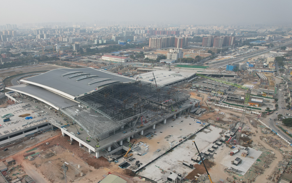 Construction of steel structures on the northern building roof of Foshan Station on the Guangzhou-Zhanjiang high-speed railway is completed on Tuesday. [photo provided to chinadaily.com.cn]