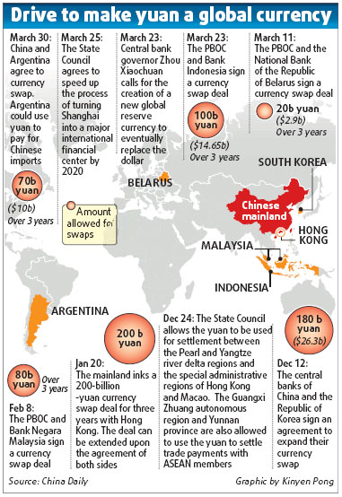 "The trial is the latest move toward making the yuan an international currency," Huang Weiping, professor of economics at Renmin University of China, said. "The prospect of a weaker US dollar is making the transition more imperative for China." The mainland is trying to promote the use of the yuan among trade partners and, in the past four months, has signed 650 billion yuan ($95 billion) worth of swap agreements with Argentina, Indonesia, South Korea, Malaysia, Belarus and the Hong Kong Special Administrative Region. The agreements allow them to use their yuan reserves to directly trade with the Chinese mainland within a set limit in volume. Stephen Green, head of China Research of Standard Chartered Bank, said the swap deals would help encourage the use of the yuan as the currency of choice for international trade.