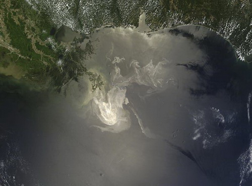 NASA MODIS satellite image, taken May 23, 2010, of the Gulf of Mexico shows the extent of the oil released from the Deepwater Horizon spill. The oil can be seen as a sheen on the water surface.[File photo / Xinhua] |