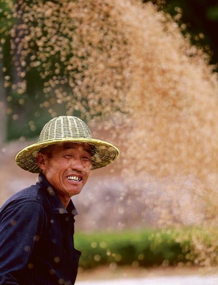 A farmer harvests grain in Huaibei, Anhui province. [Photo / China Daily]