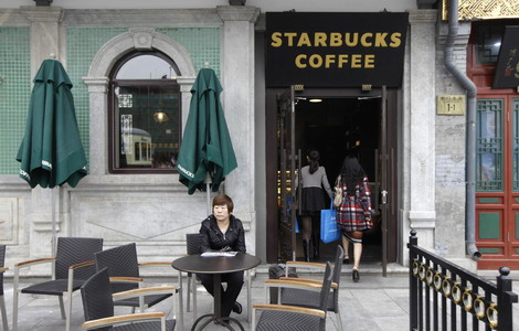 A woman rests in a yard of a Starbucks coffee store at Qianmen Commercial Street in central Beijing, April 19, 2012. [Photo / Agencies]