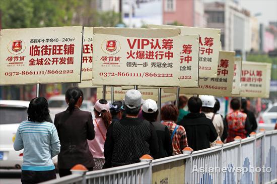 A group of women, holding billboards of a property developer, walk through the downtown area of Huaxia, Henan province, April 27, 2012. [Photo / Asianewsphoto] |