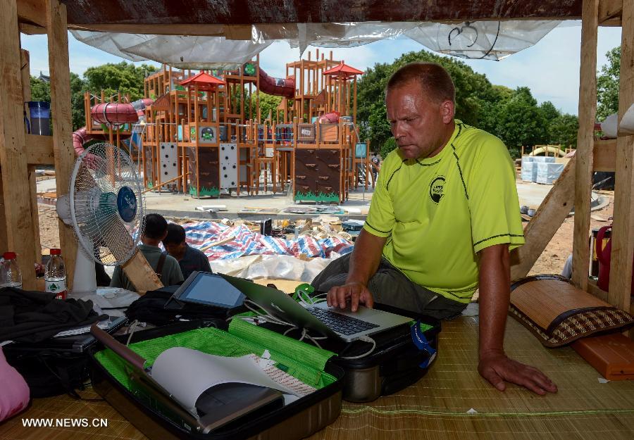 Jari Pyykka, a Finnish technical consultant, works at an Angry Birds theme park in Haining, East China's Zhejiang province, July 2, 2013. The Angry Birds theme park, the first of its kind in China, is under construction and is expected to open to the public in October. Angry Birds, created by the Finland-based Rovio Entertainment, is a popular game for smartphones and tablet computers. [Photo/Xinhua]