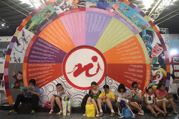The logo and film titles of Shanghai Animation Film Studio, a company under the Shanghai Film Group, are shown at an international cartoon and game expo. The group released has its preliminary prospectus, indicating its aim to become the first listed State-owned film firm. Provided to China Daily |