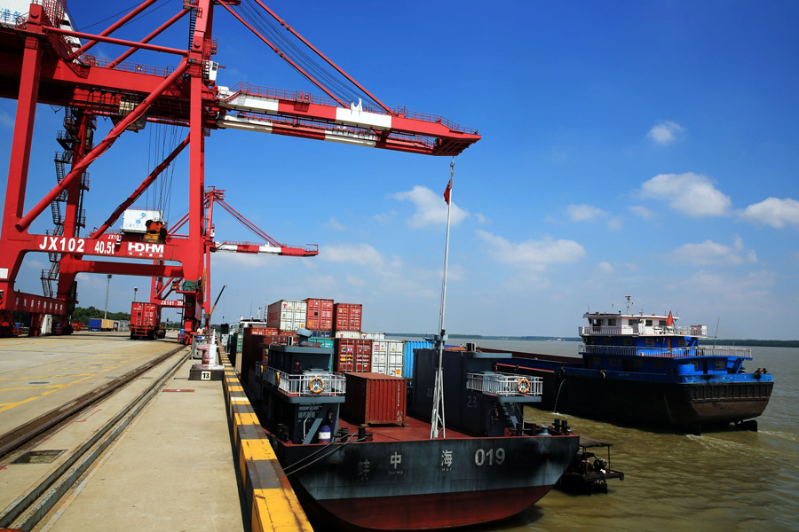 Workers load containers on to a cargo ship at a dock at Jiujiang Port, which is run by Shanghai International Port (Group) Co Ltd, along the Yangtze River in central China's Jiangxi province on June 9, 2013. [Photo by Zhang Haiyan / Asianewsphoto] |