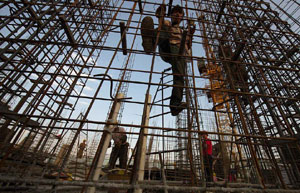 A four-storey-high model of Spider-man climbs a building wall in Yiwu, Zhejiang province, June 19, 2014. [Photo/IC]