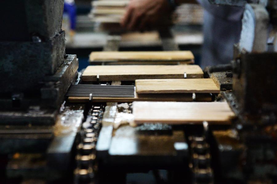 A machine produces pencils in Yuanbao village in Northeast China's Heilongjiang province on June 28. Pencils made in the village are sold to German, Russia and other countries. [Photo/Xinhua] |