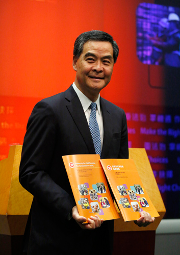 Chief Executive Leung Chun-ying poses with copies of his annual Policy Address at a news conference on Wednesday. Bobby Yip / Reuters