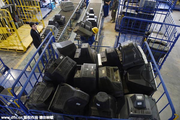 Chinese workers pile up discarded CRT TV sets to be disassembled and recycled at an electronic waste recycling factory in Fuqing city, East China's Fujian province, April 21, 2015. [Photo/IC]