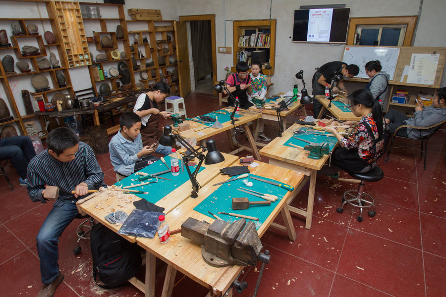 A group of students make wooden tools, May 4, 2015. [Photo/CFP]