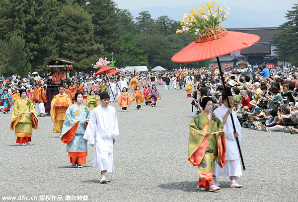People dressed in ancient Japanese costumes parade through streets flocked with tourists during the Hollyhock Festival in Kyoto, Japan, on May 15, 2015. [Photo/IC]