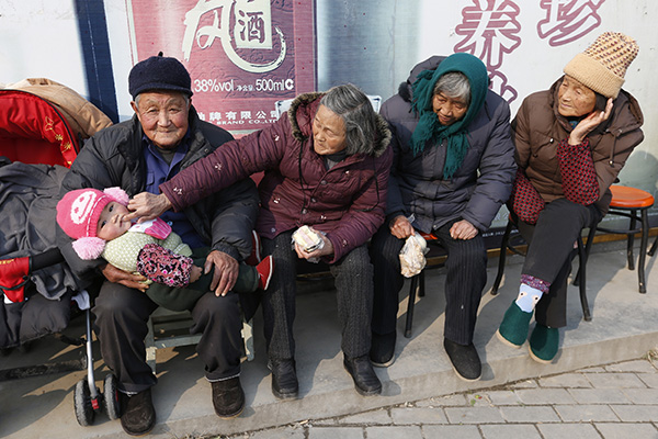 An elderly couple feed their great-grandson as two elderly women look on in Jiaxing, Zhejiang province. Many young people are not willing to have more than one child, despite the new two-child policy. [Photo/Agencies] |