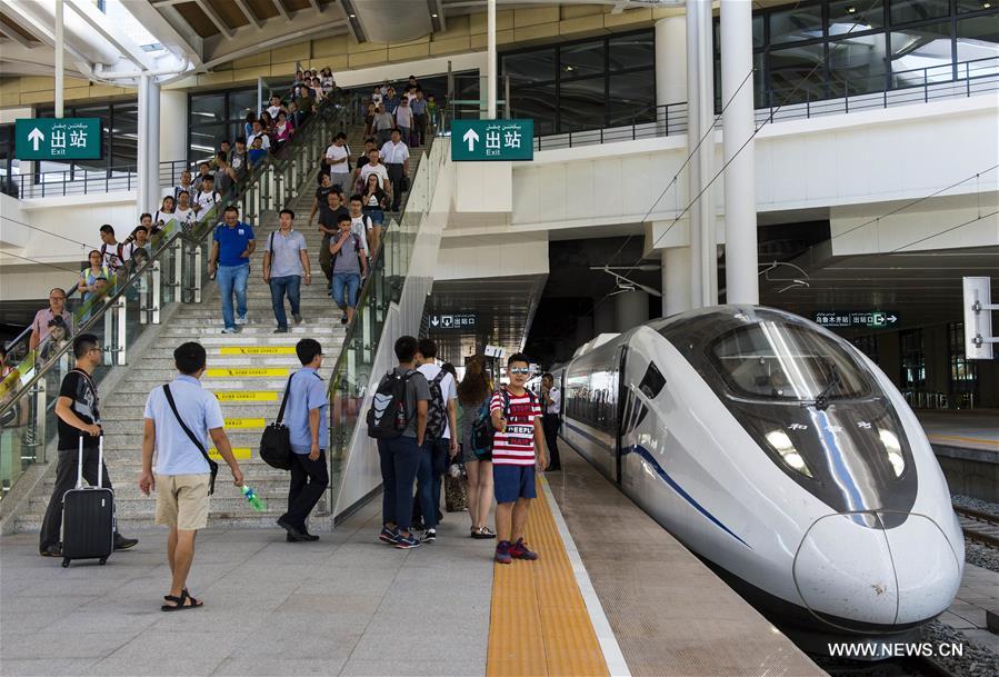 Passengers prepare to board a bullet train at the new railway station for high-speed rails in Urumqi, capital of Northwest China's Xinjiang Uygur autonomous region, Aug 12, 2016. The station, which is the railway junction with the largest scale and the most advanced facilities in Xinjiang, was put into use on Friday. [Photo/Xinhua]