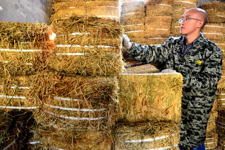 Zeng Bo, a doctorate holder in animal nutrition from Chinese Academy of Sciences, settles lucerne hay in feed room in Chenzhou, Central China's Hunan province, on December 4, 2016. [Photo/VCG]
