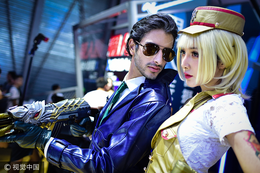 Santiago poses with a female model at ChinaJoy 2017, otherwise known as the 15th China Digital Entertainment Expo and Conference in Shanghai, on July 27. [Photo/VCG]
