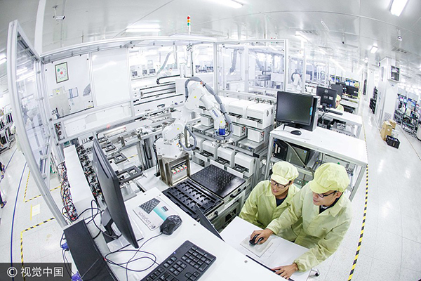 People at work in a smartphone factory in Dongguan, Guangdong province. [Photo/VCG] |