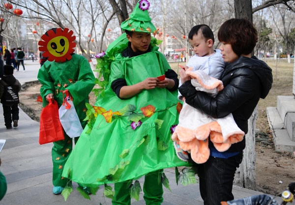 Students dressed up as trees advocate tree preservation to citizens in Liaocheng, Shandong province on March 10, 2013. March 12 is Tree Planting Day in China. [Photo by Zhang Zhenxiang/Asianewsphoto]