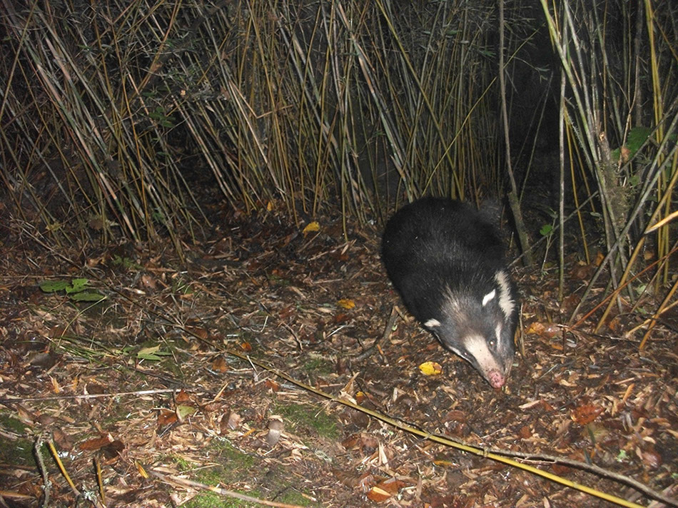 A hog badger is seen at at the Sichuan Wanglang Nature Reserve. An array of endangered species' images, which were captured by camera traps in the mountainous giant panda reserves in China, were released Wednesday by the World Wide Fund for Nature, or WWF, marking this year's International Day for Biological Diversity. [Photo provided to chinadaily.com.cn]