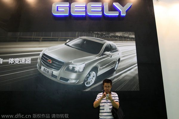 A visitor uses his mobile phone in front of the stand of Geely during an automobile exhibition in Shanghai, June 4, 2013. [Photo/IC] |