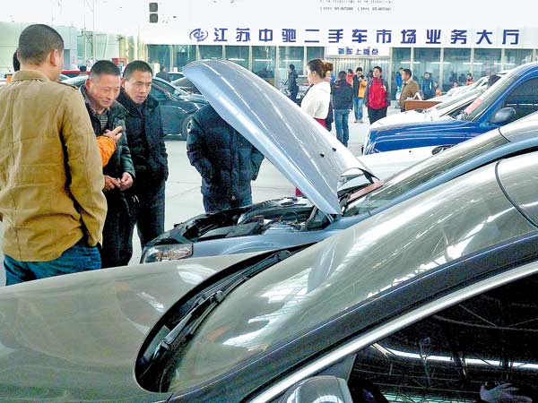 Potential buyers check out cars at a used vehicle market in Nanjing. [Photo by Wang Luxian/For China Daily]
