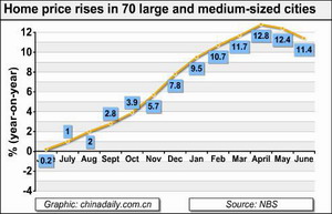 Housing prices in major Chinese cities rose 11.4 percent year on year in June, one percentage point lower than the increase in May, the National Bureau of Statistics (NBS) said Monday.