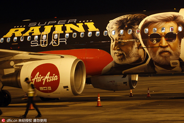 A ground staff member walks past the Malaysia-based budget carrier AirAsia plane dedicated to Rajinikanth and painted with his pictures after it landed in Bangalore, India, July 22, 2016. [Photo/IC] |