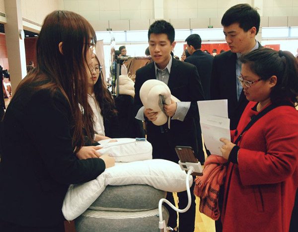 Employees from Seblong Technology (Beijing) Co Ltd introduce the smart pillow to customers at a fair in Shanghai. [Photo provided to China Daily] |