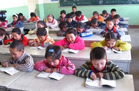 Students from different ethnic groups read a story from their textbooks at the No 2 Primary School in Zepu county, Xinjiang Uygur autonomous region, on Oct 25, 2010.