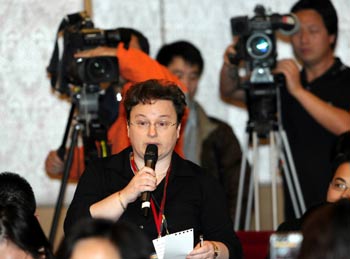 A foreign journalist raises questions during a press conference on