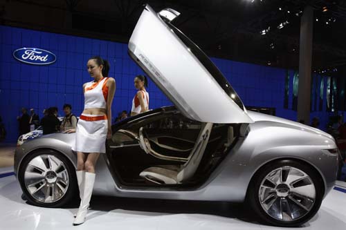 Chinese models pose beside a Ford Refl3x concept car at the Beijing International Automotive Exhibition November 18, 2006. Ford Motor Co. expects its current pace of doubling Chinese sales to continue for the rest of the year and into 2007, as it prepares to add the award-winning S-MAX model early next year. [Reuters]