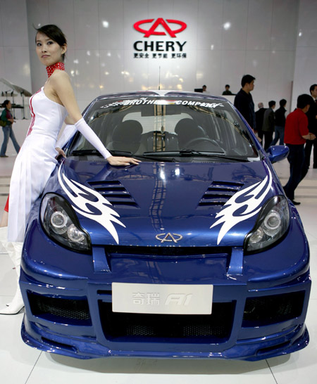 A model stands next to a Chery A1 sedan during the Shanghai Auto Show in Shanghai April 21, 2007. [Xinhua]