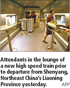 earlier. The seats are like those on an airplane only bigger and with more leg room with small tables in the front and a rack for magazines, trash bags and directories in the back. In addition, the dining car waiters and waitresses were attired in smart uniforms similar to ones worn by air stewardesses as they pushed food-and-drinks trolleys down the aisle. Loic Benoit, a French businessman on train D533 from Beijing to Tianjin yesterday morning, said the travel experience was comparable to that in France: "Nice and comfortable." High-speed rail service is common in countries like France, Germany and Japan but it was not until yesterday that China began to run trains at 200 kph and above. D460, which left Shanghai at 5:38 am and arrived in Suzhou 39 minutes later,