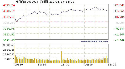 Stocks jump high, Shenzhen index breaks record, 05/17By Li Zengxin (chinadaily.com.cn)Updated: 2007-05-17 16:26 Mainland stocks saw another day of big jump today after yesterday's surge, moving out of the shade of the steep slump on Tuesday. The Shanghai Composite Index opened higher and closed at 4,048.29, up 62.25 points or 1.56 percent from the previous closing.