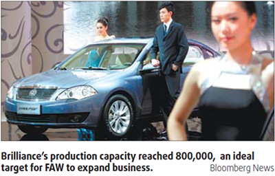 Industry experts said Brilliance's production capacity reached 800,000, which made it an ideal target for FAW to expand business. Rapid expansion has strained Brilliance' financial resources. The company was further hit by slow sales in 2008 when the company sold a total of 285,000 units, which was less than 40 percent of its total production capacity. In April, Brilliance Auto chairman Qi Yumin said in the Shanghai auto expo that he would not exclude any reforming proposal, "as long as it can benefit the development of the brand". Brilliance is owned by the Liaoning provincial government. The company has invested in about 100 companies, with total assets amounting to 30 billion yuan. (For more biz stories, please visit Industries)