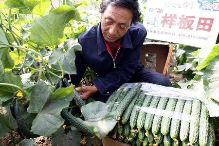 A farmer who uses Shengmingsu produced by Wu Zishen's Yongye International harvests cucumbers on his farmland in North China's Inner Mongolia autonomous region. [Zhang Wei / China Daily] |