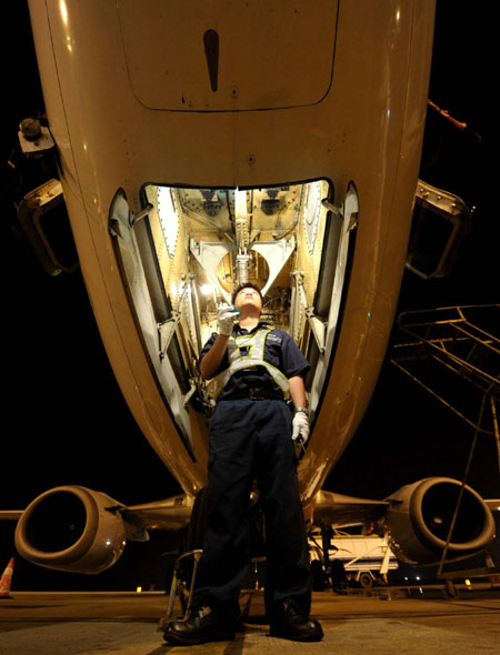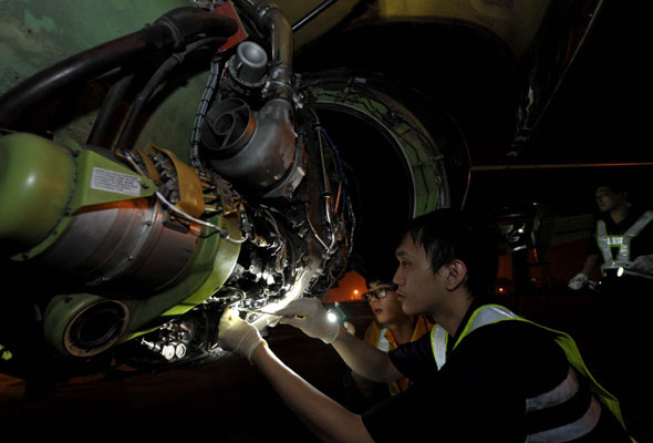 Two mechanics conduct routine maintenance for a plane at a parking apron in the evening of Oct 18, 2012 at Meilan International Airport, Haikou city, Hainan province. [Photo/Xinhua] |