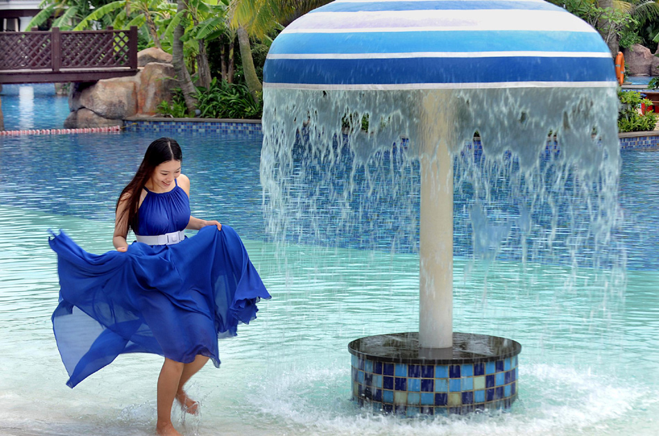 A visitor plays in a thermal spring swimming pool on May 18, 2013 at Guanlan Lake Holiday Resort in Haikou city, Hainan province. [Photo/Xinhua]