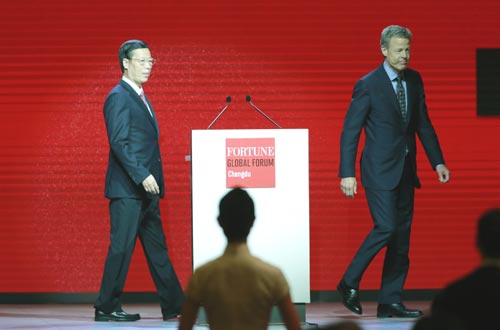 ![]() Vice-Premier Zhang Gaoli, accompanied by Time Warner Inc Chief Executive Jeff Bewkes, walks to the podium to deliver his keynote speech at the opening ceremony of the Fortune Global Forum in Chengdu, Sichuan province, on Thursday. [Feng Yongbin / China Daily] |