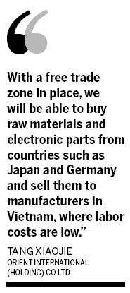 "With a free trade zone in place, we will be able to buy raw materials and electronic parts from countries such as Japan and Germany and sell them to manufacturers in Vietnam, where labor costs are low," said Tang.