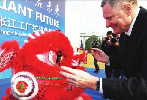 David Preston, president of Boehringer Ingelheim China, dots the eyes of a lion head during the ground breaking ceremony of the expansion of its Zhangjiang Plant in Shanghai in 2011. CHINA DAILY |