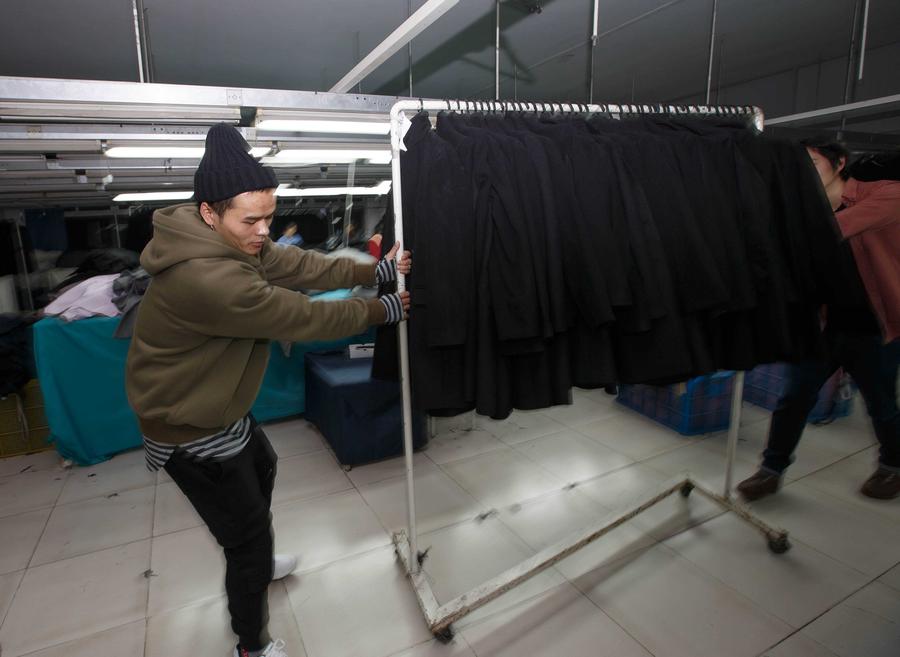 Xie Feiqiao (front) and Zheng Xiao push clothes out of the workshop, in Nantong, Jiangsu province, Nov 16, 2015. [Photo/Xinhua]