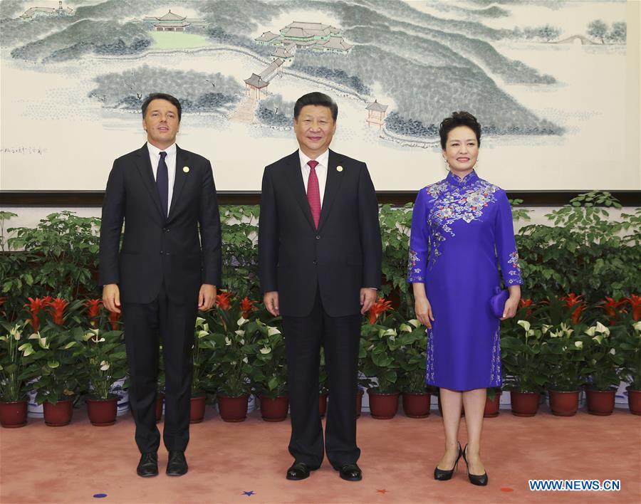 Chinese President Xi Jinping and his wife Peng Liyuan welcome Italian Prime Minister Matteo Renzi before a banquet for the G20 Summit in Hangzhou, capital of East China's Zhejiang province, September 4, 2016. [Photo/Xinhua]