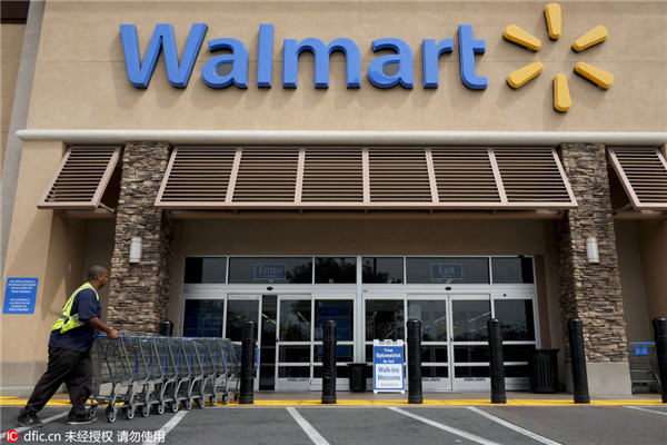 A worker pushes shopping carts in front of a Wal-Mart store in La Habra, California on May 9, 2013. [Photo/IC]